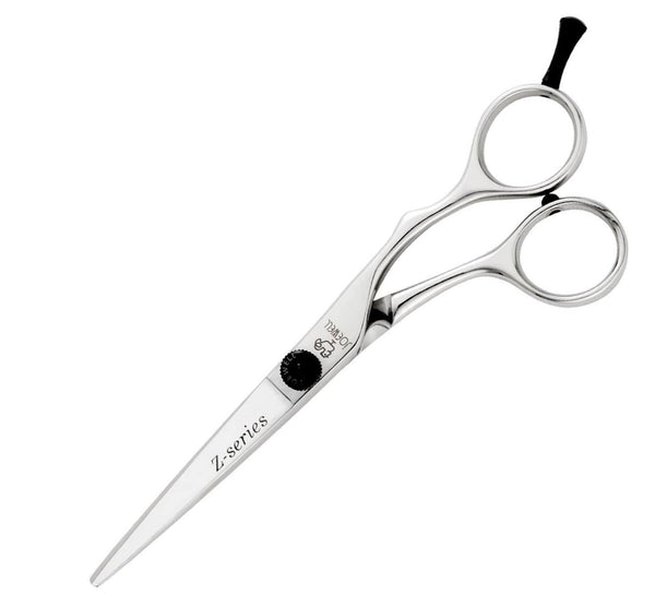 A lightweight scissor that matches the heavyweights in strength. The new Joewell Z series scissor has two hand sharpened blades, ensuring very long life and durability. It fearures a stylish black tension screw in the centre of the scissors, with a matching black finger rest and stopper.