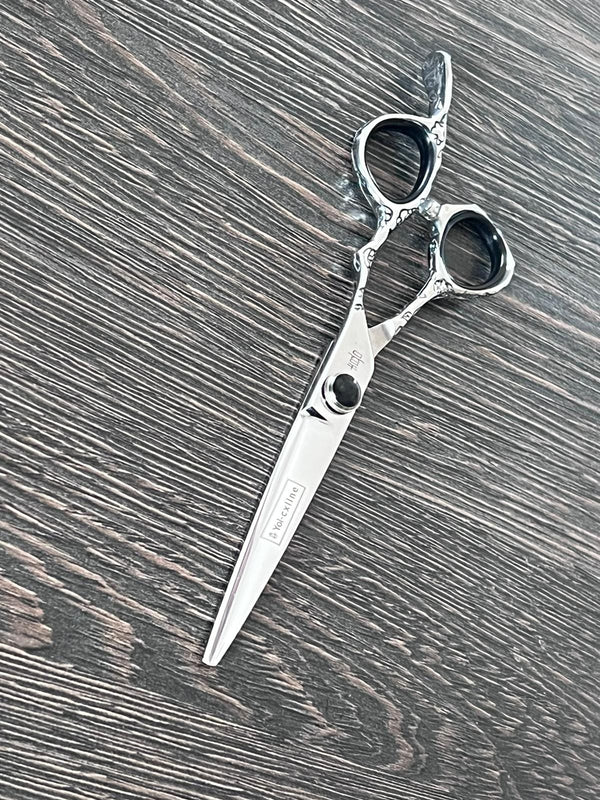 Yoi CX Line Silver Offset Tattoo 6inch scissors they come in Black Screw, Pink Screw or Pink Jewel - They are made from a high quality 440 Japanese steel and have convex edges and slim smooth edges perfect for all cutting tekniques Jewelled Tension Screw. Scissors designed with very exiting looks and balanced for precision cutting.