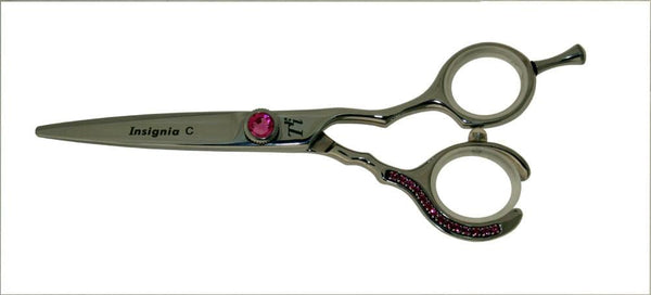 The TRI Insignia scissors in 5.5 inch and 6" are a distinctive looking forged scissors made from Japanese steel with pink crystal decoration on the easy to use tension screw. The finger rest is removeable. Finger hole reducers can be removed as well.