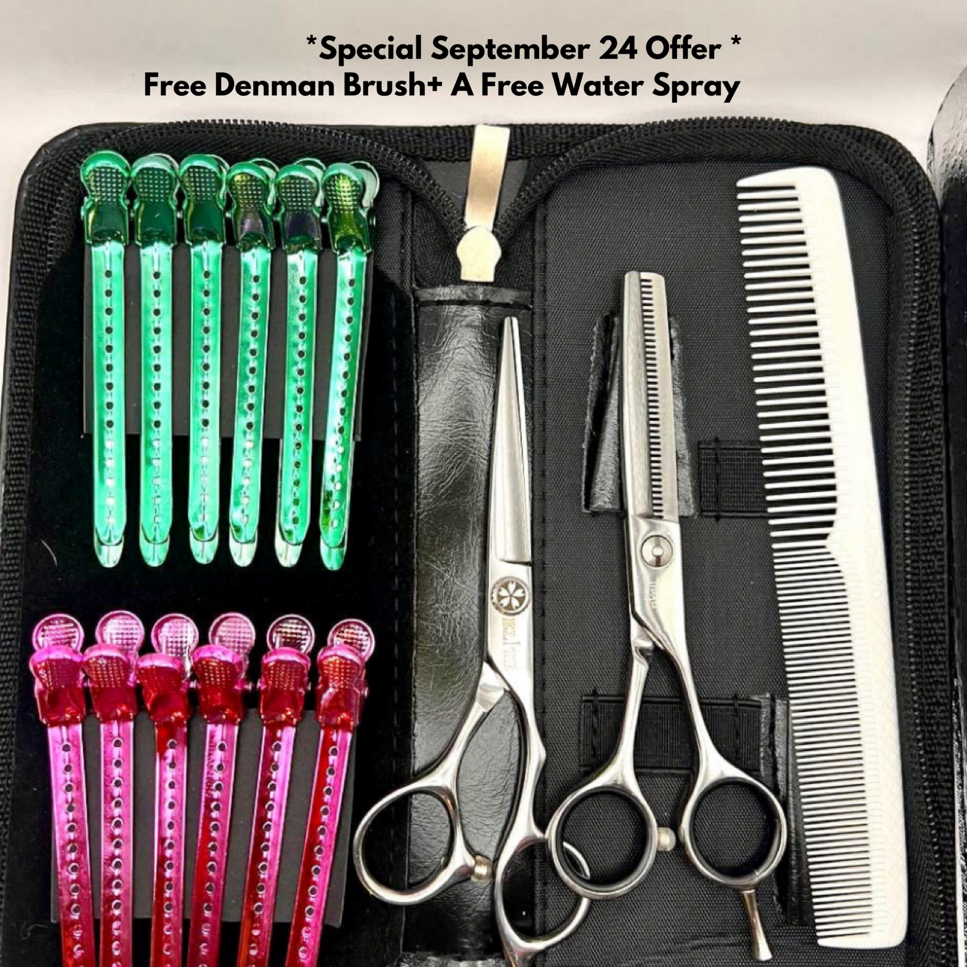 OHKA ND 5, 5.5 or 6 or 6.5 with a set of Yoi CXline texturisers plus a comb and 6 free clips. Includes a handy zip case .. normally £145 plus vat + ** While stock lasts** (Limited time offer Free Denman brush and a Free Water Spray )