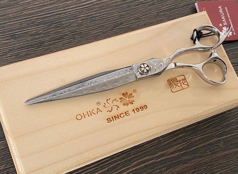 Ohka FXD Damascus model with beautiful Damascus grain finish. Highly Tempered and hand folded to promote a one of a kind Damascus Grain every scissor is different.. Comfort fit handles with non serrated slicer blades. Japanese Hand Made scissors.